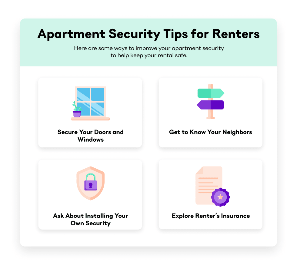 Make sure your windows and doors, particularly sliding doors, are secure. If your unit is older, your property manager may be open to paying for updates, including new windows. Or you can purchase security bar locks or similar gadgets. They're relatively affordable and can be installed without tools.