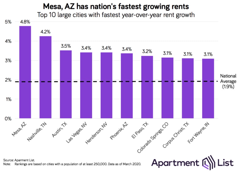Looking beyond the most recent month of data, Mesa, AZ tops our list for the nation's fastest rent growth over the past year. Rents in Mesa have grown by 4.8 percent over the last year, well over double the national rate. Mesa is located just outside of Phoenix, which ranks sixth on the list at 3.4 percent. Mesa is followed in the rent growth rankings by Nashville (4.2 percent) and Austin (3.5 percent), two fast-growing mid-sized cities that continue to attract renters from around the country.