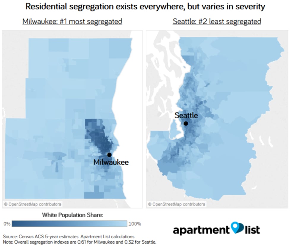 To better visualize what patterns of residential segregation look like, the following maps show the white share of tract-level population across the Milwaukee metro -- the metro with the highest overall segregation index of the 50 largest metros -- and the Seattle metro, which has the second-lowest overall segregation index: