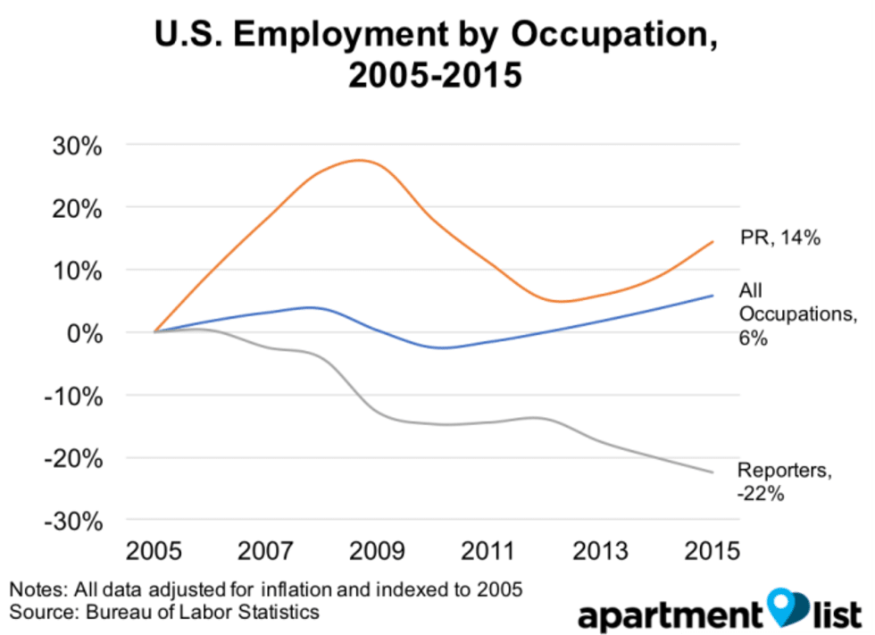 In contrast to reporter wages, other occupations have seen income growth over the past decade. The median wage increased by 1% from 2005 to 2015, and PR jobs (a common path for reporters leaving the industry) have seen incomes rise by 4%. This has widened the gap between PR and reporter salaries, with the median PR salary being $56,770 in 2015, compared to $36,360 for a reporter.