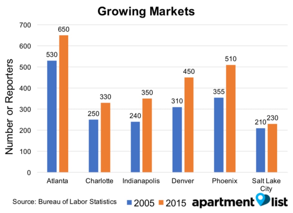 Despite the national trend of a decrease in reporters, some metros that have experienced large population growth over the past decade have gained more reporters. The number of reporters in Denver, Phoenix, and Indianapolis all grew by over 40%. Rising employment does not necessarily equal increased wages, however: in Charlotte, for example, employment is up by 32% but salaries are down 19% (even as rents rose 7%).