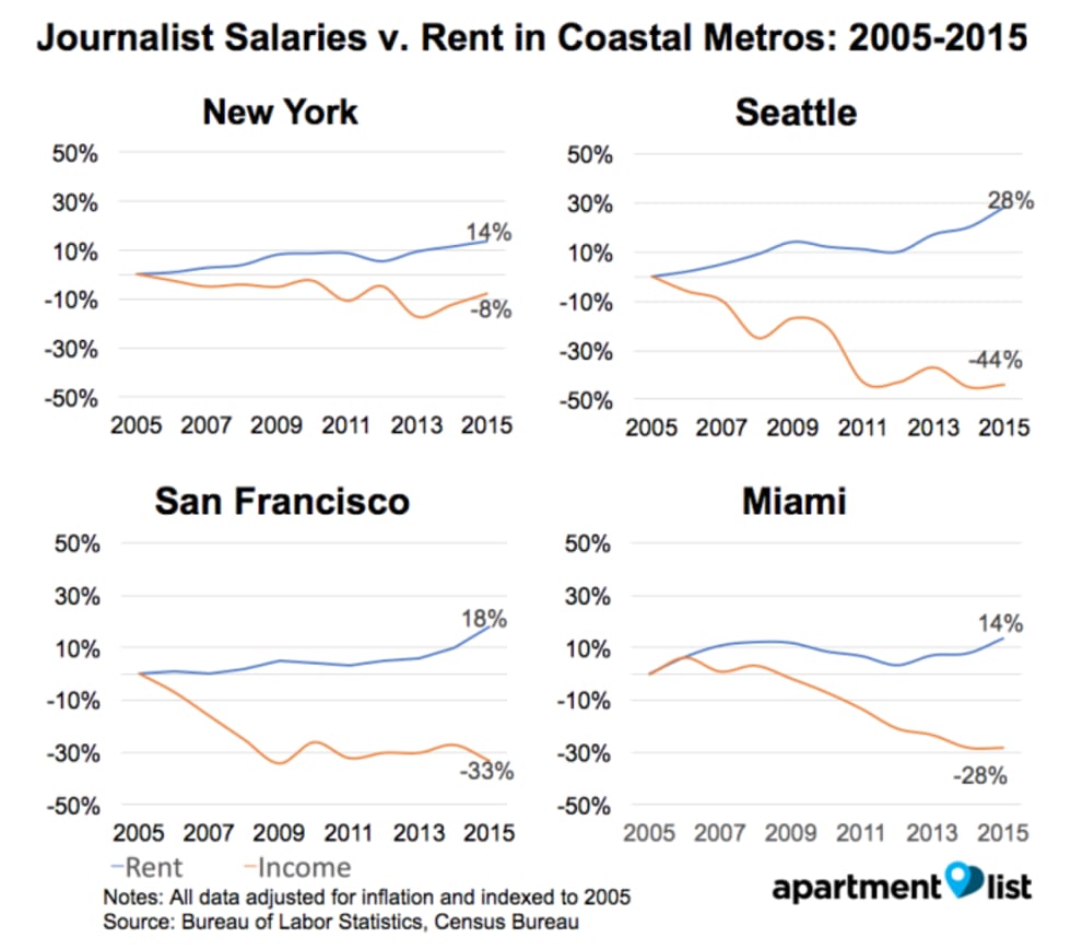 For example, in New York City where 8.5% of the country’s journalists reside, salaries decreased 8% while rents increased 14%. Seattle, San Francisco, and Miami all saw gaps in rent and wage growth of 42% or more.